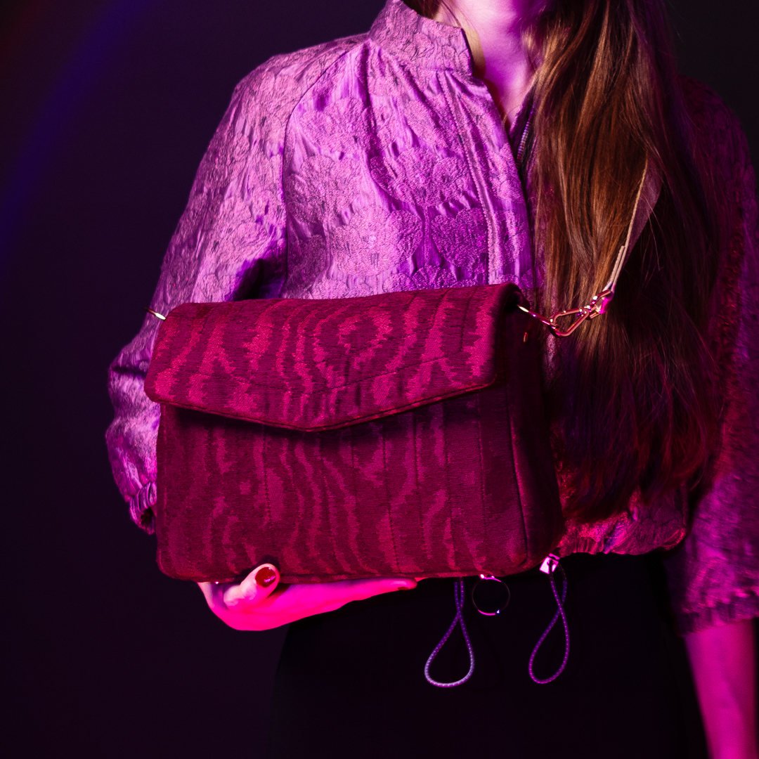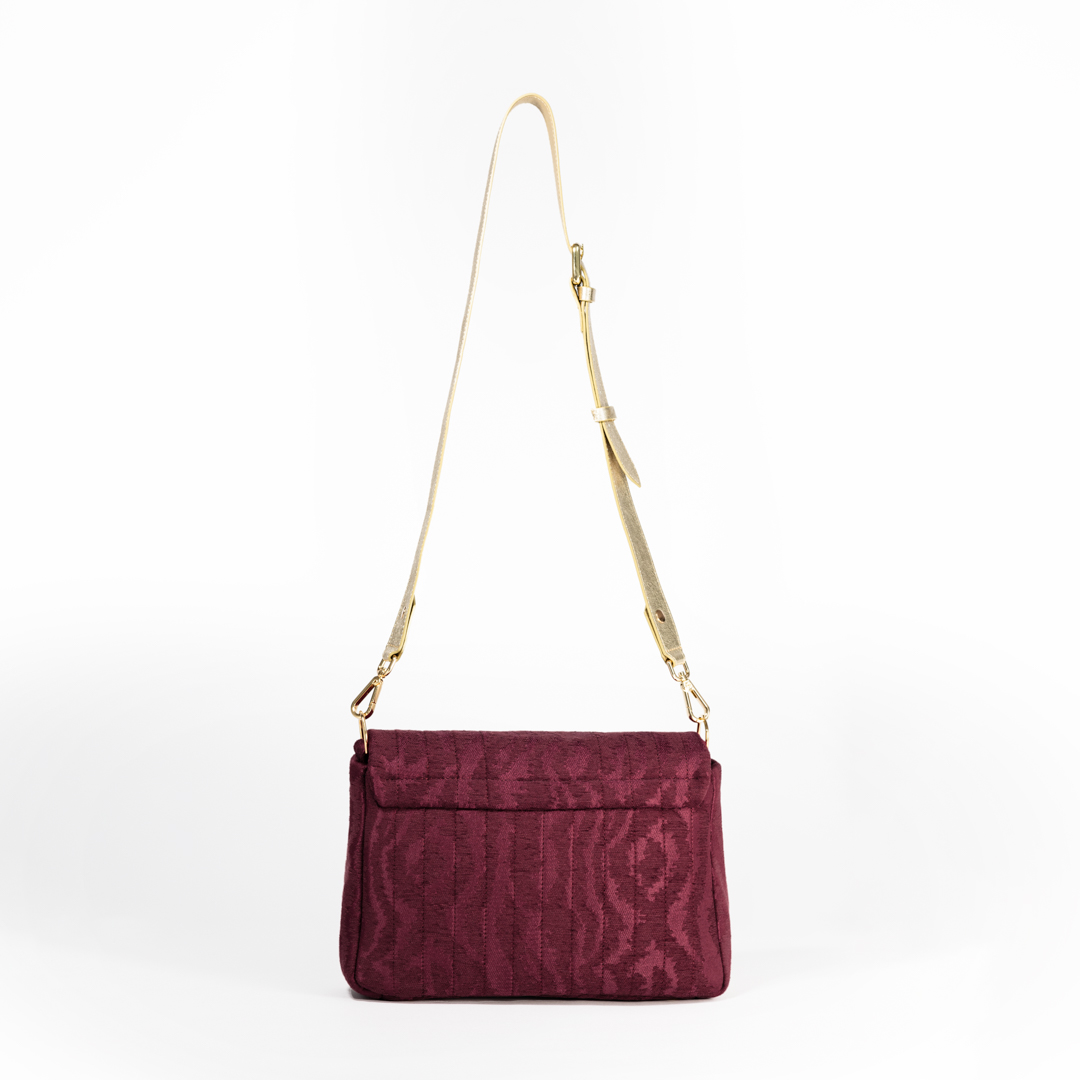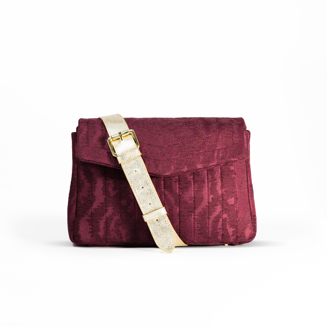 Elegant, lightweight, and versatile: This burgundy crossbody bag, crafted from high-quality jacquard fabric with a shimmering moiré texture, is the perfect companion for both everyday wear and special occasions. The golden strap, made from soft cowhide leather, adds a modern touch and can be easily attached using the side metal rings. A discreet magnetic closure ensures quick and effortless access.